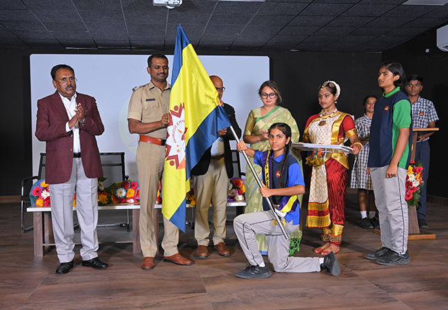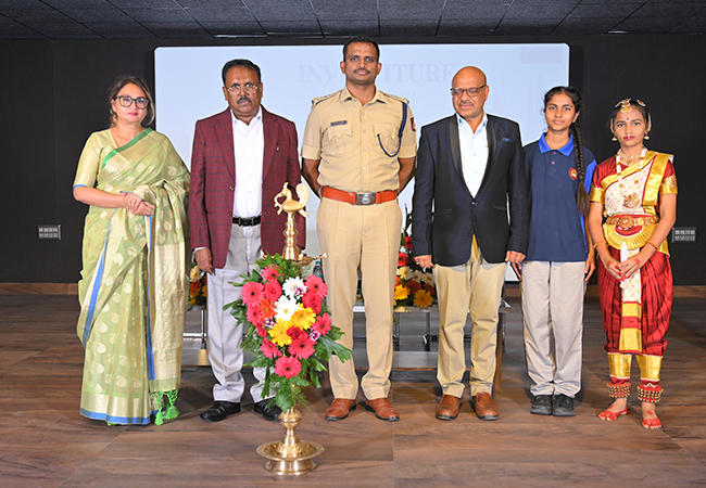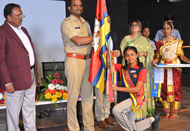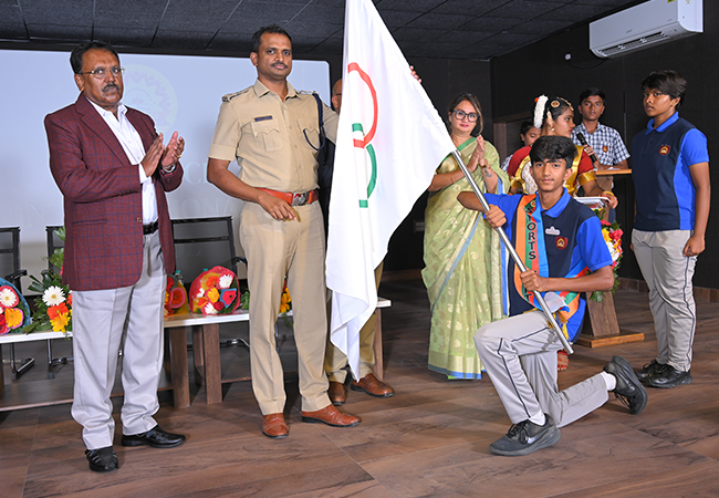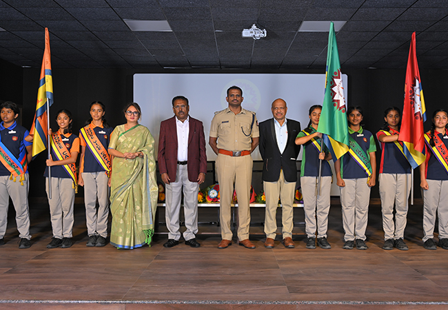 The ceremony commenced with a warm welcome to the distinguished guests, staff, parents, and students. The Chief Guest for the day was Mr. Ashok K.V., I.P.S, Superintendent of Police, Tumakuru District, whose inspiring speech motivated students to lead with integrity and dedication.