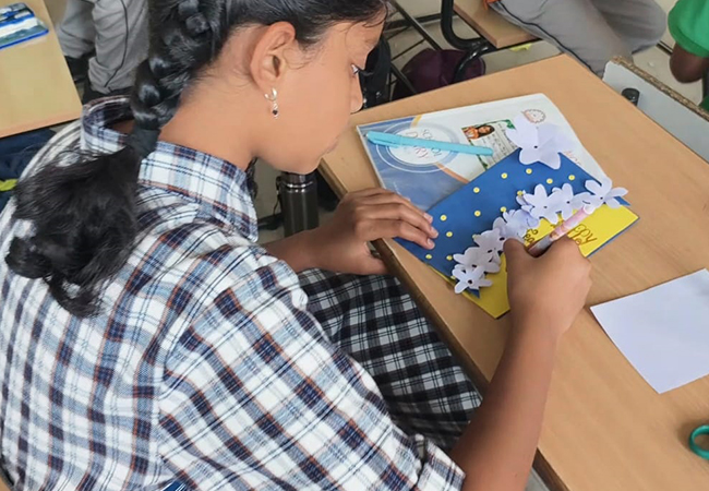 With materials in hand, students' creativity flourished as they designed and crafted Rakhis in various patterns and designs, showcasing their innovative ideas. Similarly, Grade 6 and 7 students used the 3H approach (Head, Heart, Hand) to create heartfelt greeting cards for their teachers.